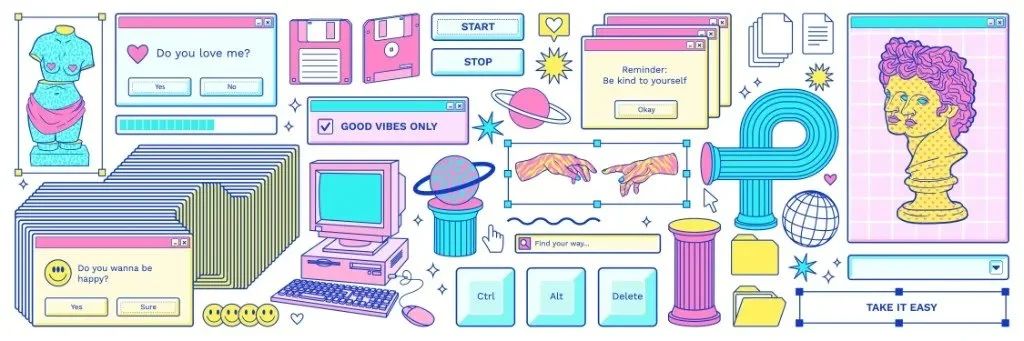 對(duì)于插圖和圖形,請(qǐng)考慮復(fù)古數(shù)字元素和全息貼紙,為社交媒體帖子賦予千禧年的氛圍。