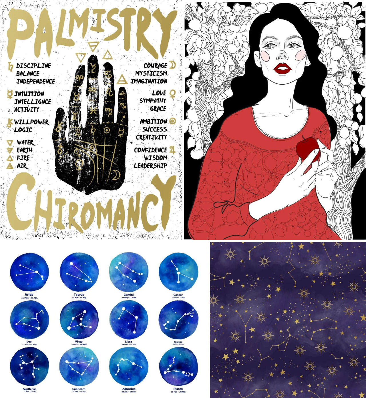 對(duì)于神秘設(shè)計(jì)的趨勢(shì),您可以去用綜合材料創(chuàng)作有手工風(fēng)格的插圖,例如水彩紋理和凸版印刷風(fēng)格,以挖掘該趨勢(shì)的另類文化情緒。