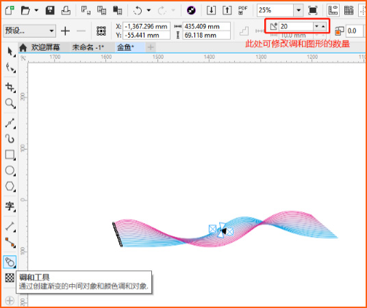 使用調和工具,將兩條曲線進行過渡,打造出摩爾紋。